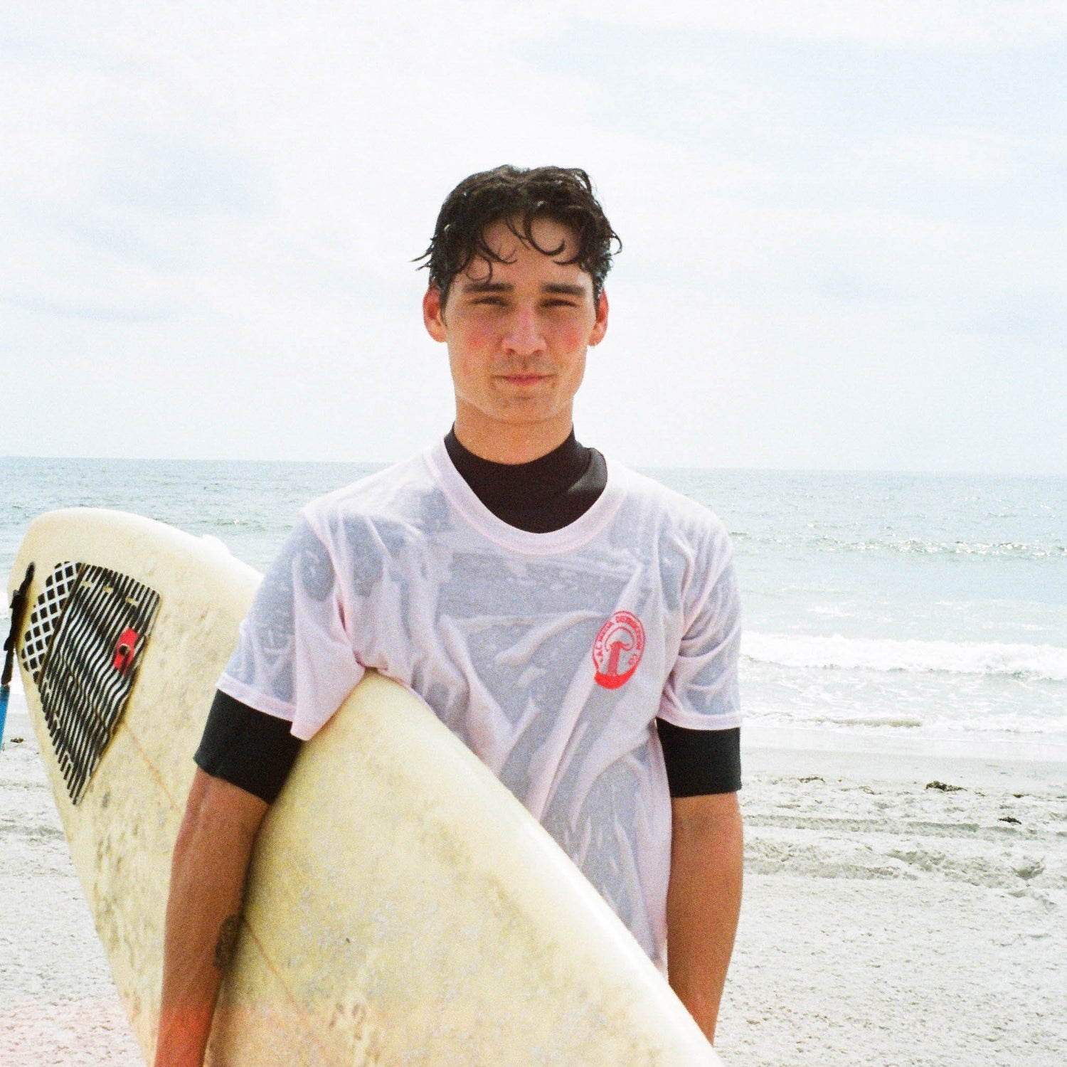 Mac Meda’s original graphics reference a variety of motifs and symbols that embody their place and time. Their most notable design is the mushroom cloud logo, still prominently displayed on stickers around La Jolla and neighboring cities. Graphics also referenced their beloved beach, proudly flaunting “Club Windansea” with a hand grenade printed across the back.