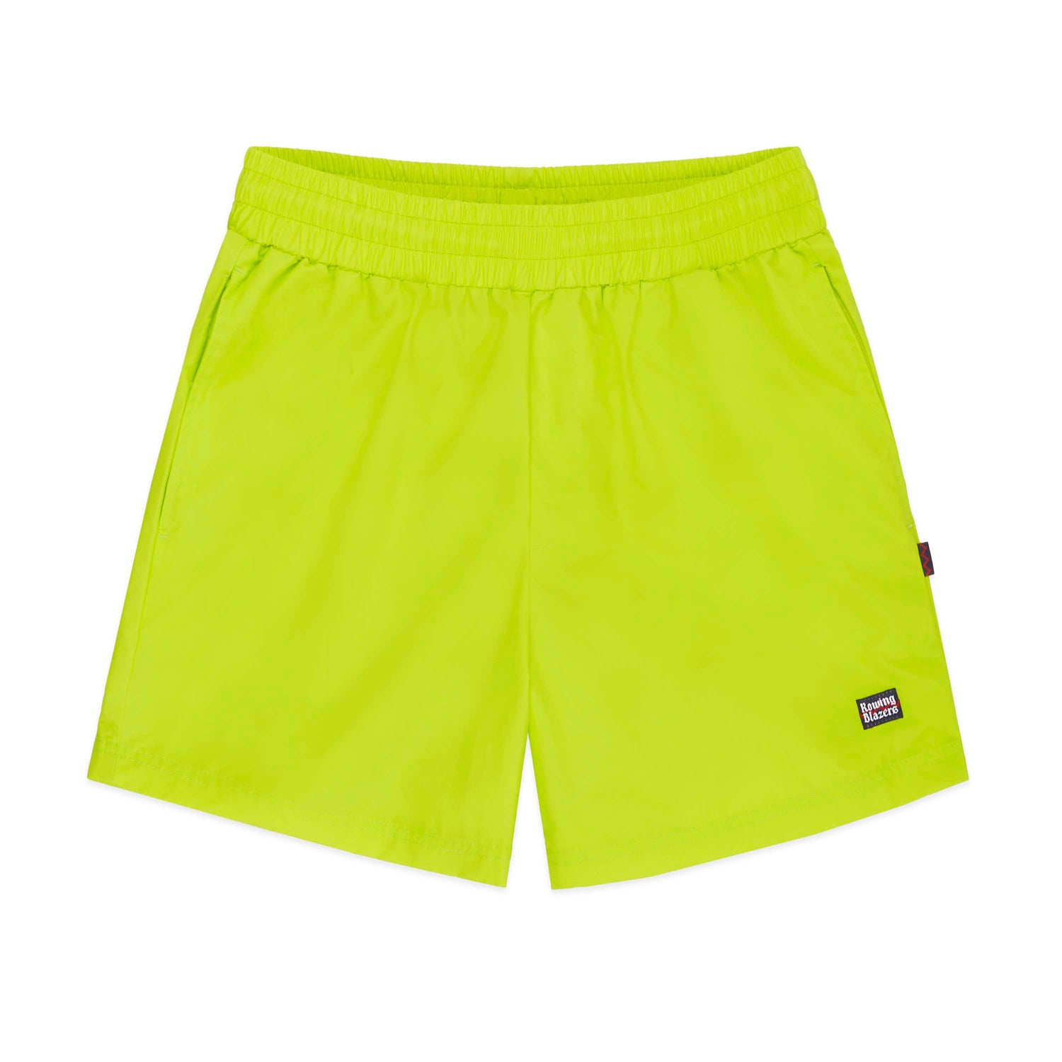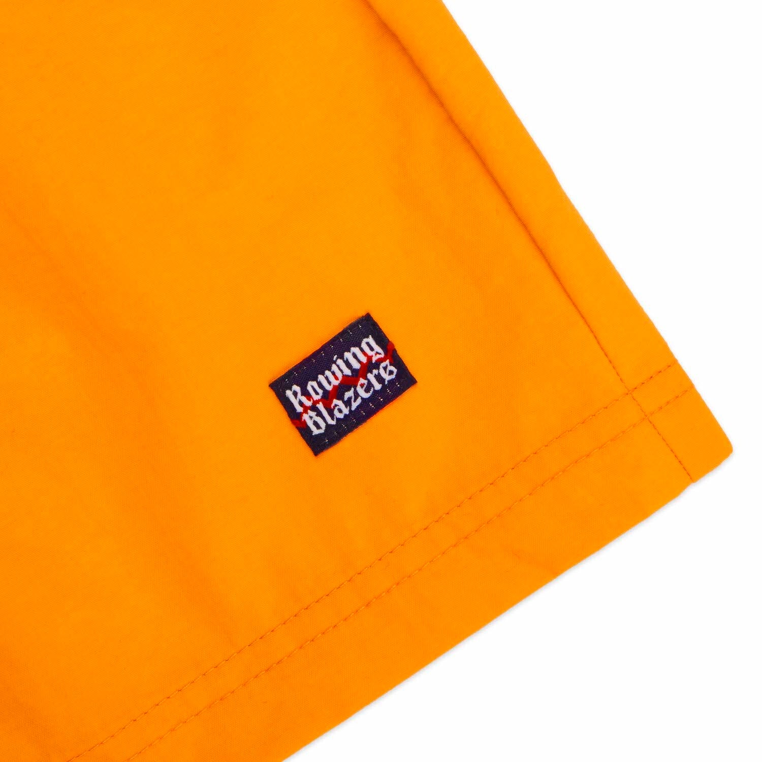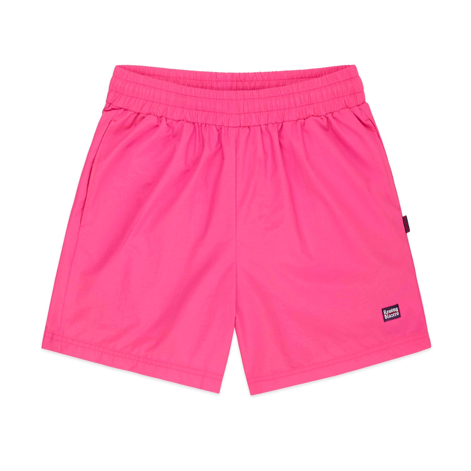 Nylon shorts with Rowing Blazers box logo label on wearer's left leg, side pockets, and an elastic drawstring waistband.