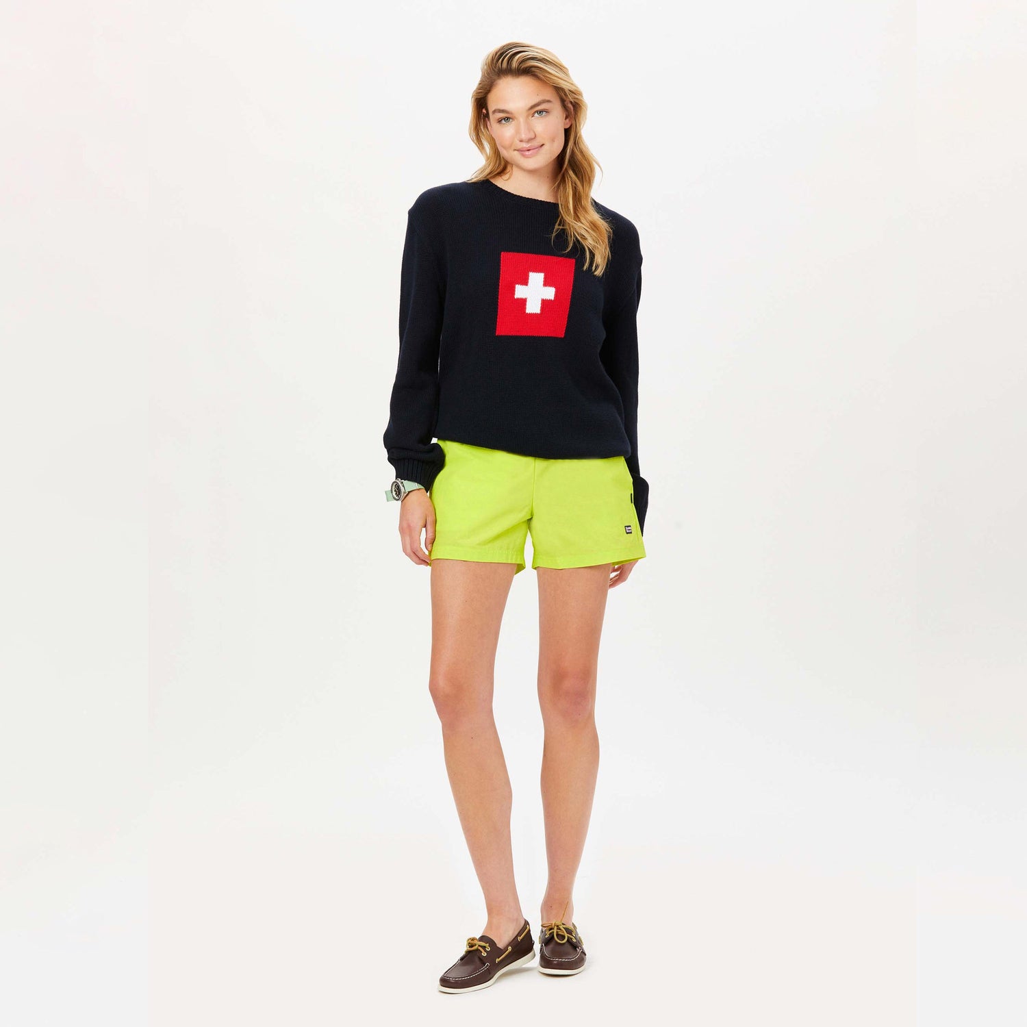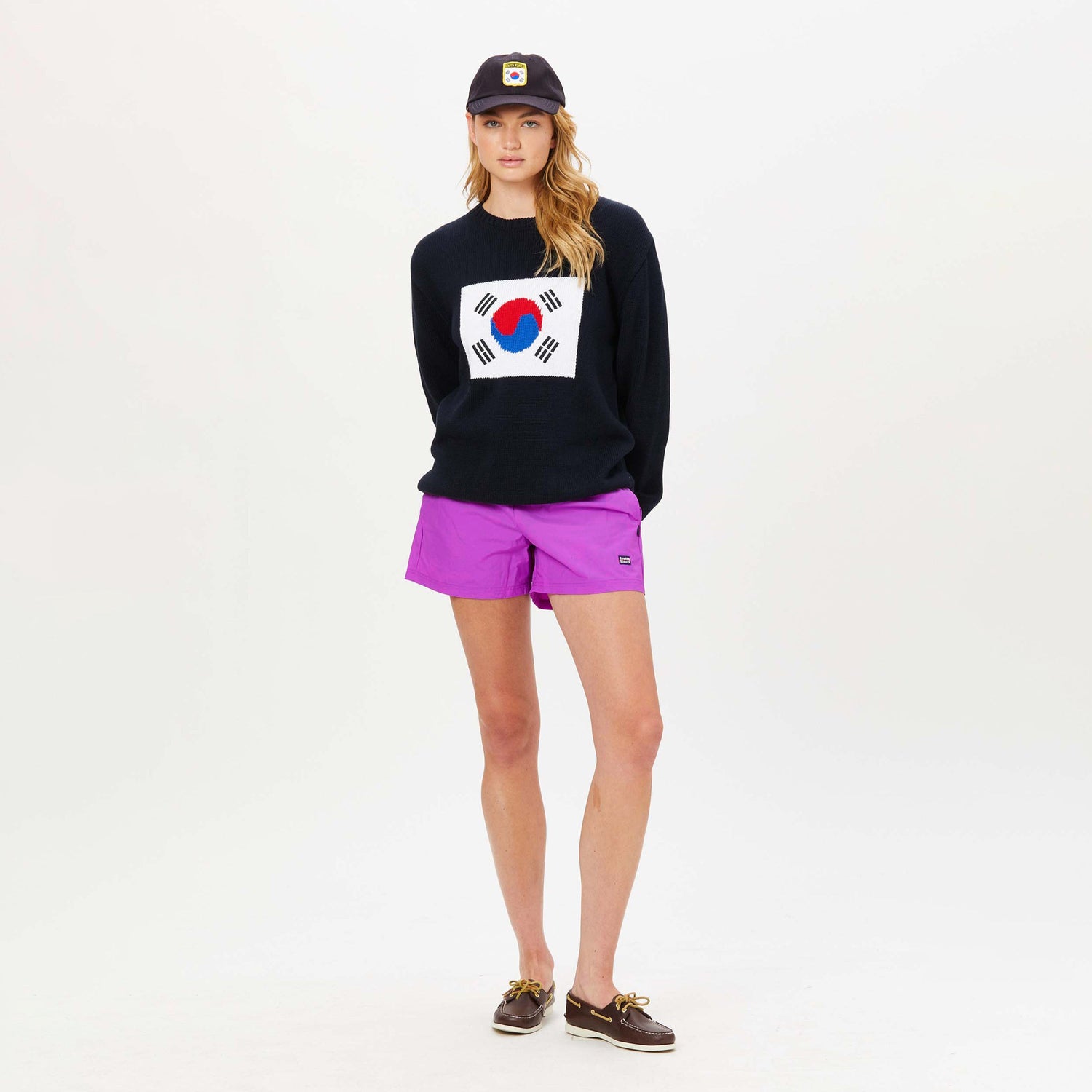 The Rowing Blazers International collection is inspired by the power of travel and the beauty of sport. '90s-inspired nylon running shorts that double as swim trunks, as well as nylon hats in a rainbow of neon colors; tourist-inspired tees (including a dual-color tee inspired by one of RB founder Jack Carlson's favorite hotel "Do Not Disturb" signs from his collection); and a less parochial take on the classic flag sweater, featuring the flags of some places that are particularly close to our hearts or have some meaning in our lives.
