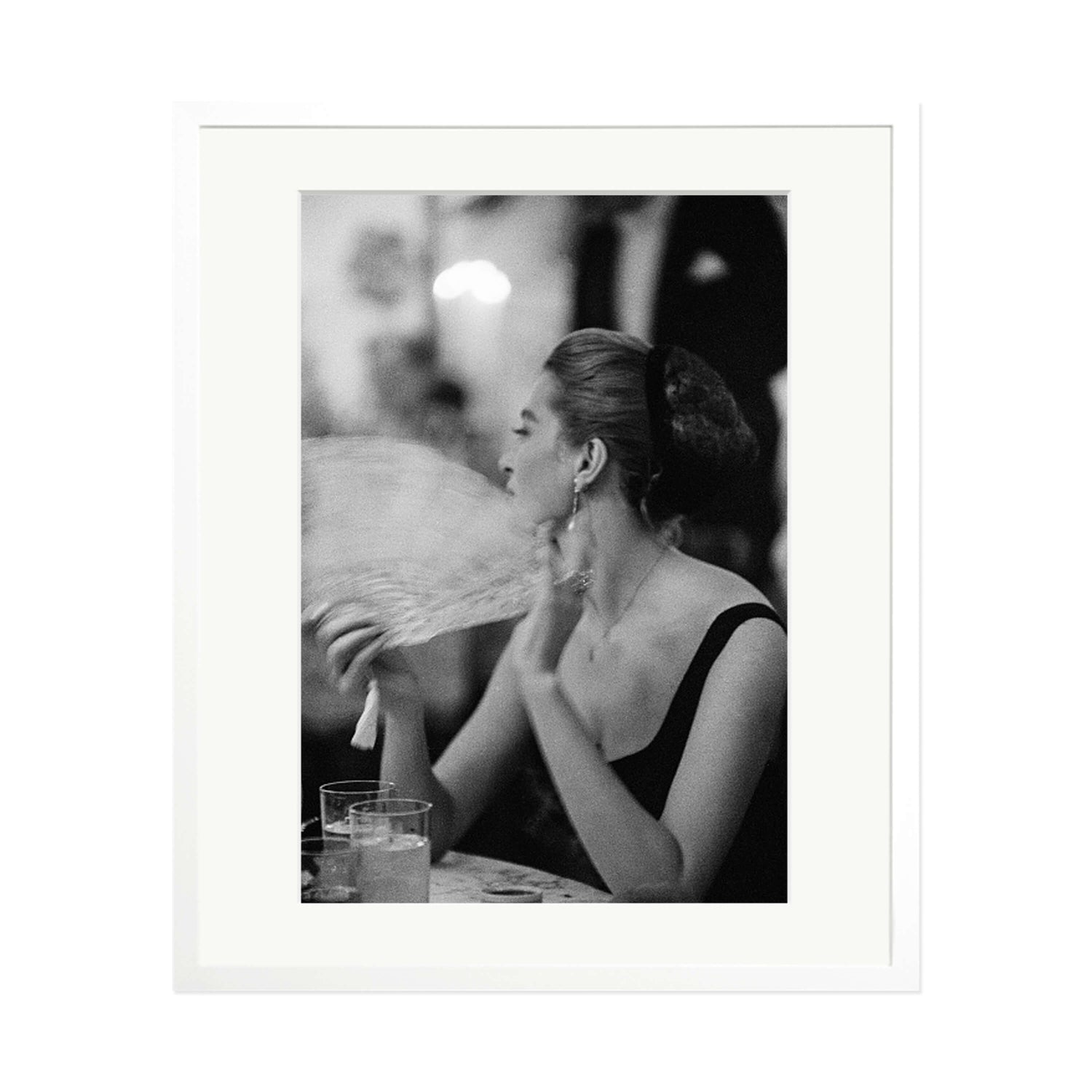 Limited-edition numbered print. Photograph by Slim Aarons featuring French actress Capucine, (Germaine Lefebvre) fanning herself at a New Years Eve party held at Romanoffs in Beverly Hills.