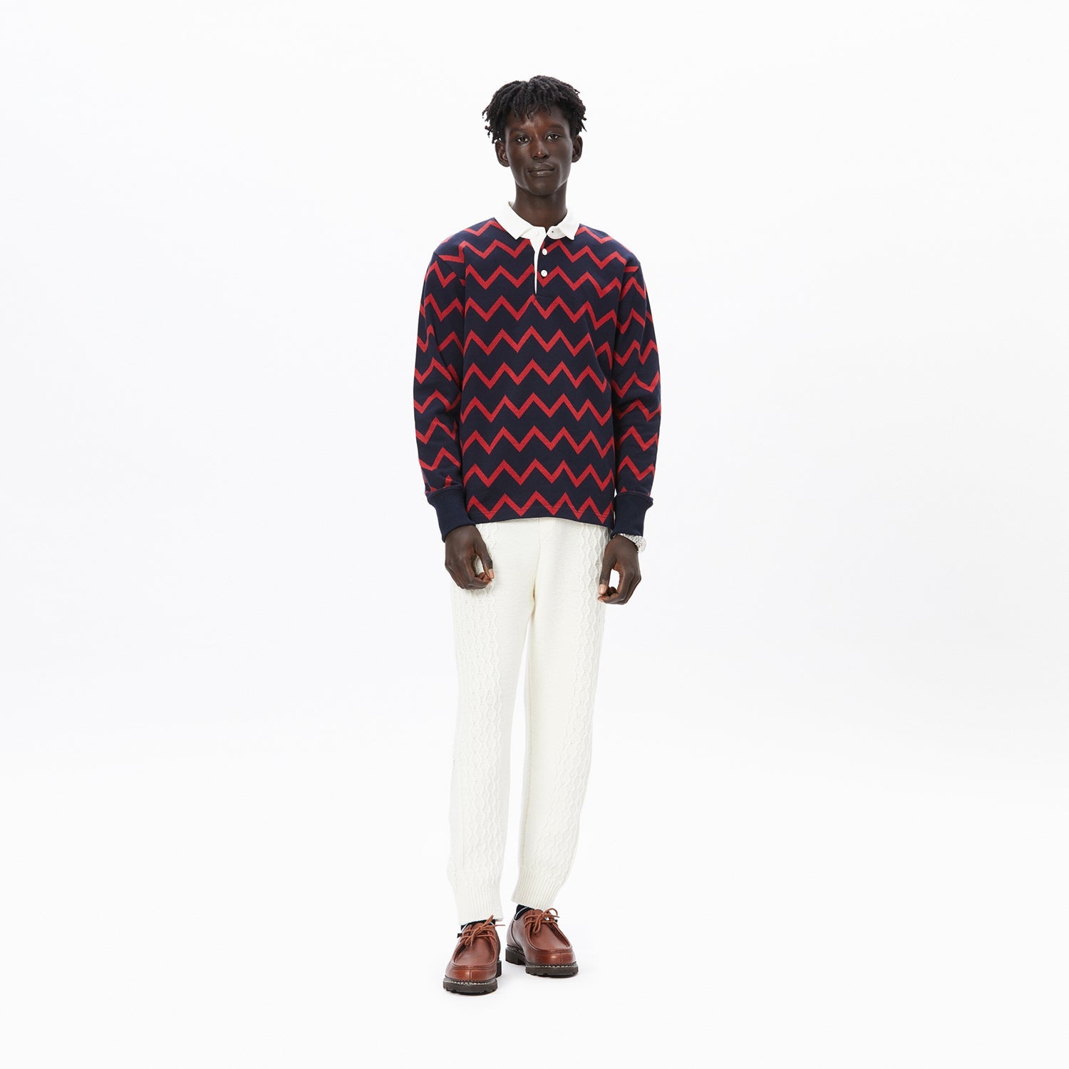 Rugby collar; three-button placket; gorgeous rib knit cuffs. Made in Portugal.