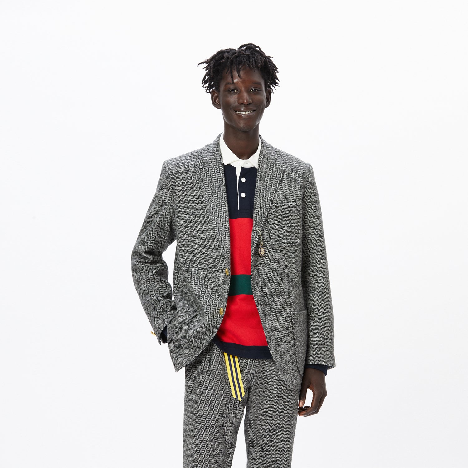 "I started Rowing Blazers four years ago to inject a sense of fun and humor into the classics. Since then, we've become known for our irreverence, use of color, attention to detail and obsessive dedication to quality, as well as our unexpected collaborations and cult following. This season, with that sense of fun and humor in mind, we asked Pete Davidson and Ziwe Fumudoh to be the face of our collection. We love them. The collection leans into color and texture, with made-to-order men's and women's suit separates in brightly colored corduroy and the brand's signature gun check and patchwork tweed; American-made cotton duck travel jackets with corduroy collars; sherpa jockey fleeces in new colorways as well as the brand's trademark 'croquet stripe' and navy-red zig-zag pattern; rugby shirts in bright stripes as well as tie-dye; playing card knitwear; sweats, tees and accessories; as well as a range of '80s inspired sweaters made in collaboration with old-school English brand Gyles & George, founded by former member of British parliament Gyles Brandreth. I think sometimes people hear the word 'classics' and they think 'stuffy.' They hear 'preppy' and they think of something elitist and cringeworthy. These concepts have been hijacked and given a bad name. They're supposed to be about bright colors and beautiful fabrics, but more importantly: having fun, being yourself, and flipping the bird to anyone who takes themselves too seriously." - Jack Carlson