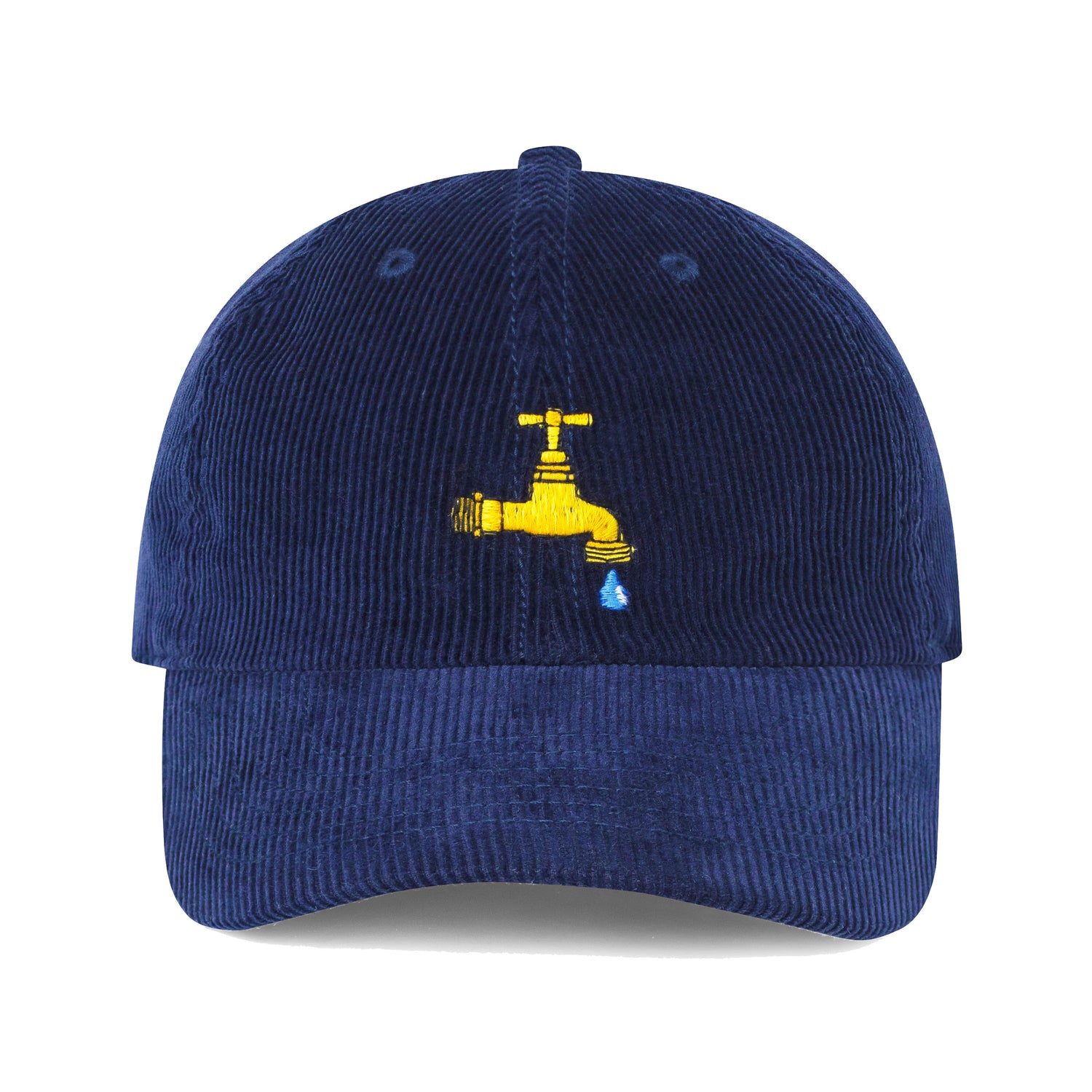 Navy blue corduroy dad hat with satin-stitched faucet motif.