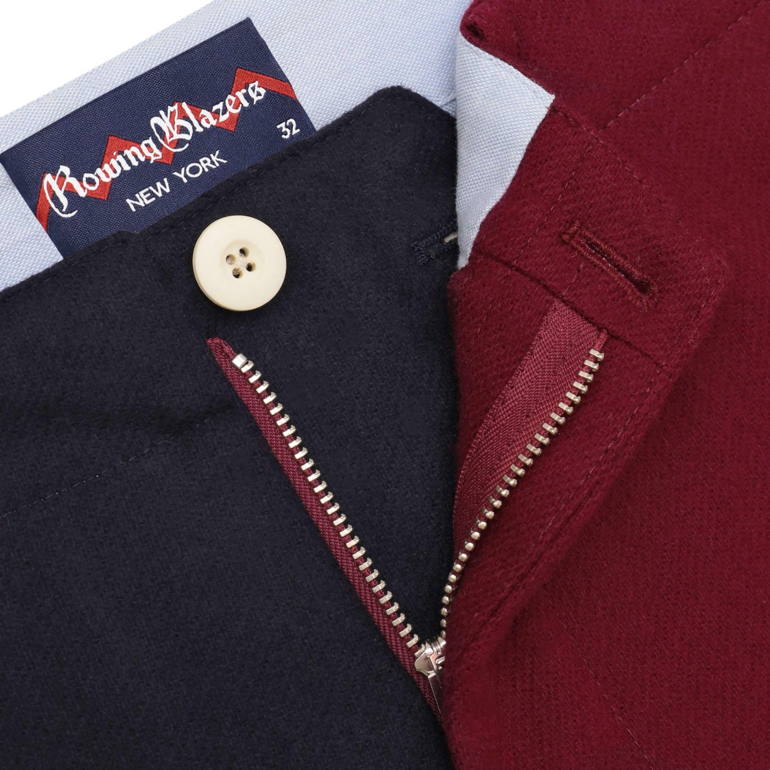 Vintage-inspired colorblock "fun" pants in navy, red, yellow, and green wool. Slightly tapered, tailored fit.