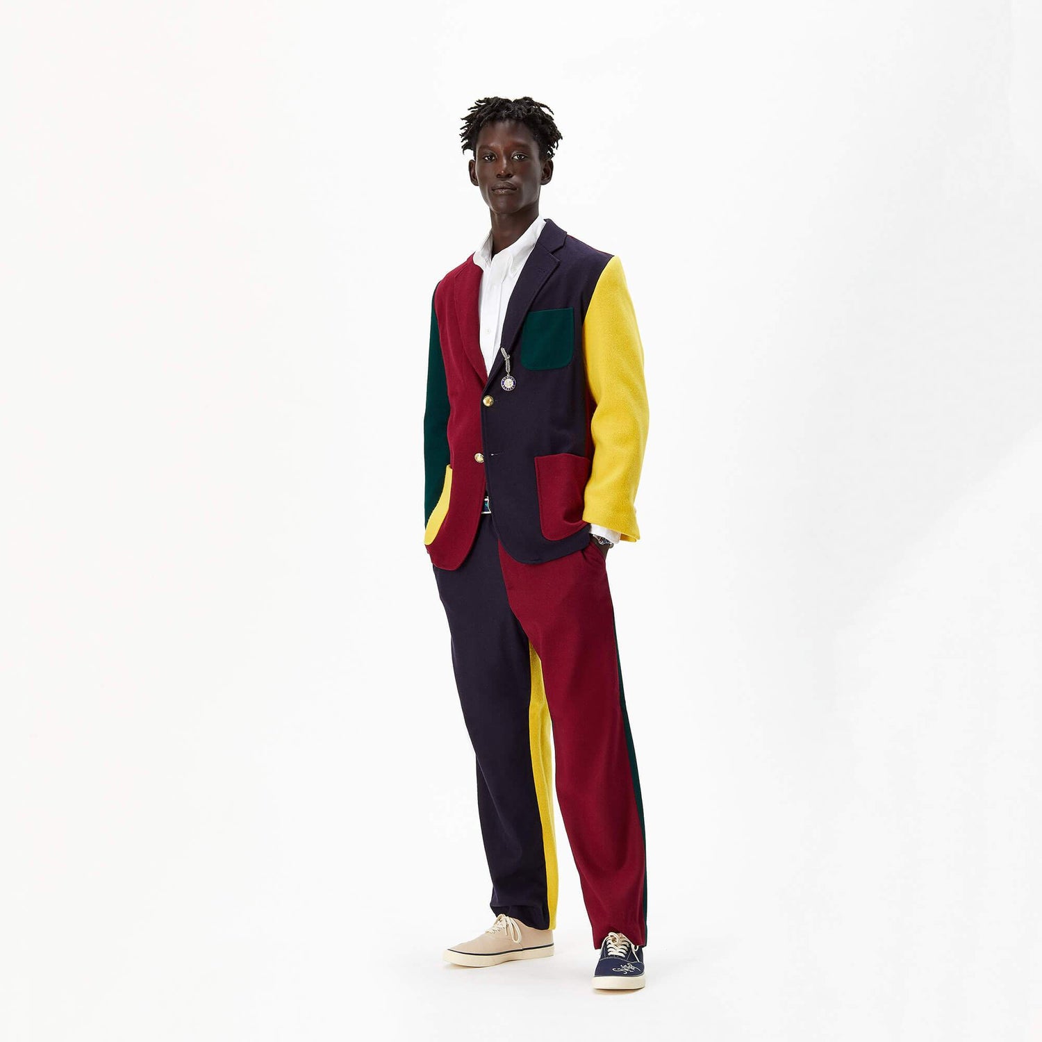 An irreverent American classic. Four panel colorblock trousers in navy, red, green, and yellow.