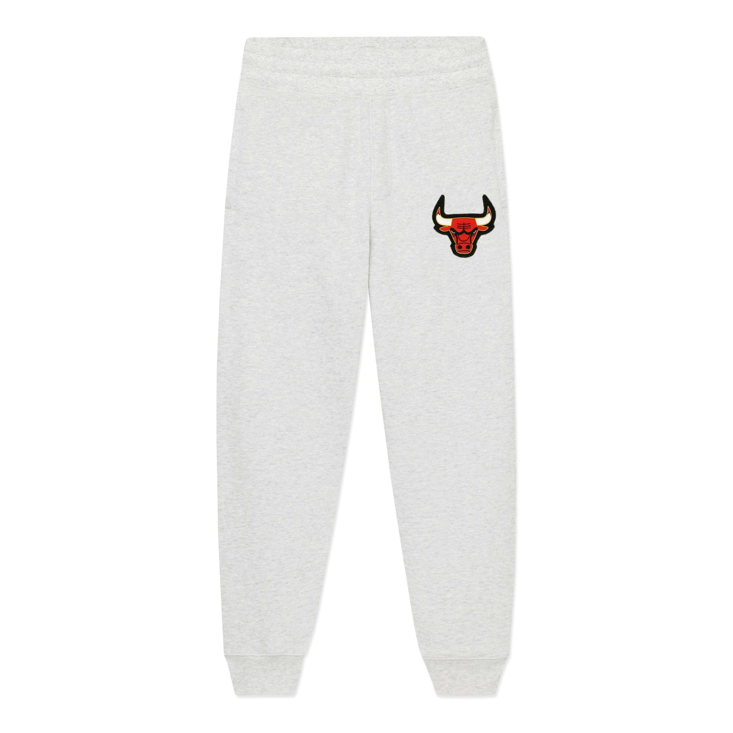 Luxurious French terry loopback jogger sweatpants. Heather gray, 100% cotton. Hand-embroidered Chicago Bulls goldwork bullion wire badge. Made in Portugal.