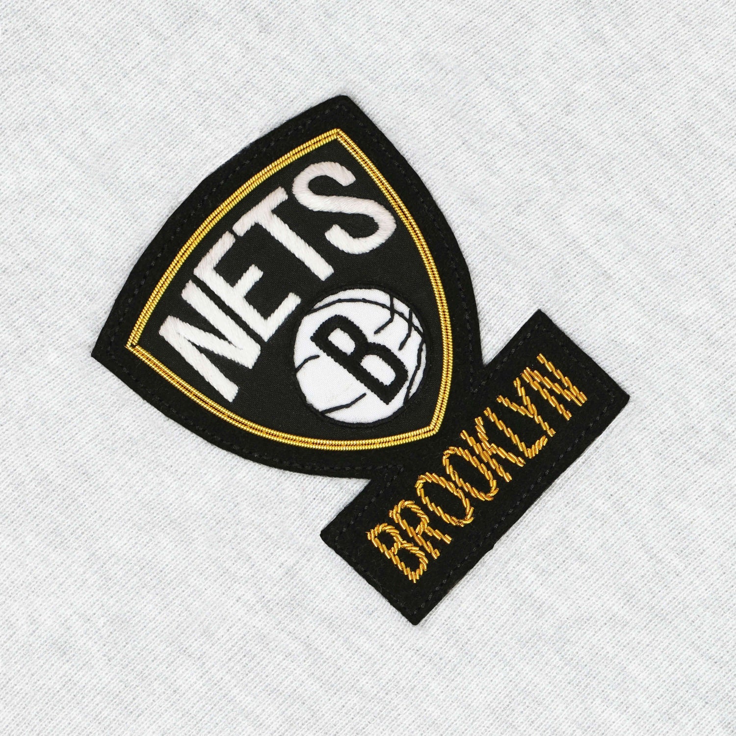 Luxurious French terry loopback jogger sweatpants. Heather gray, 100% cotton. Hand-embroidered Brooklyn Nets goldwork bullion wire badge. Made in Portugal.