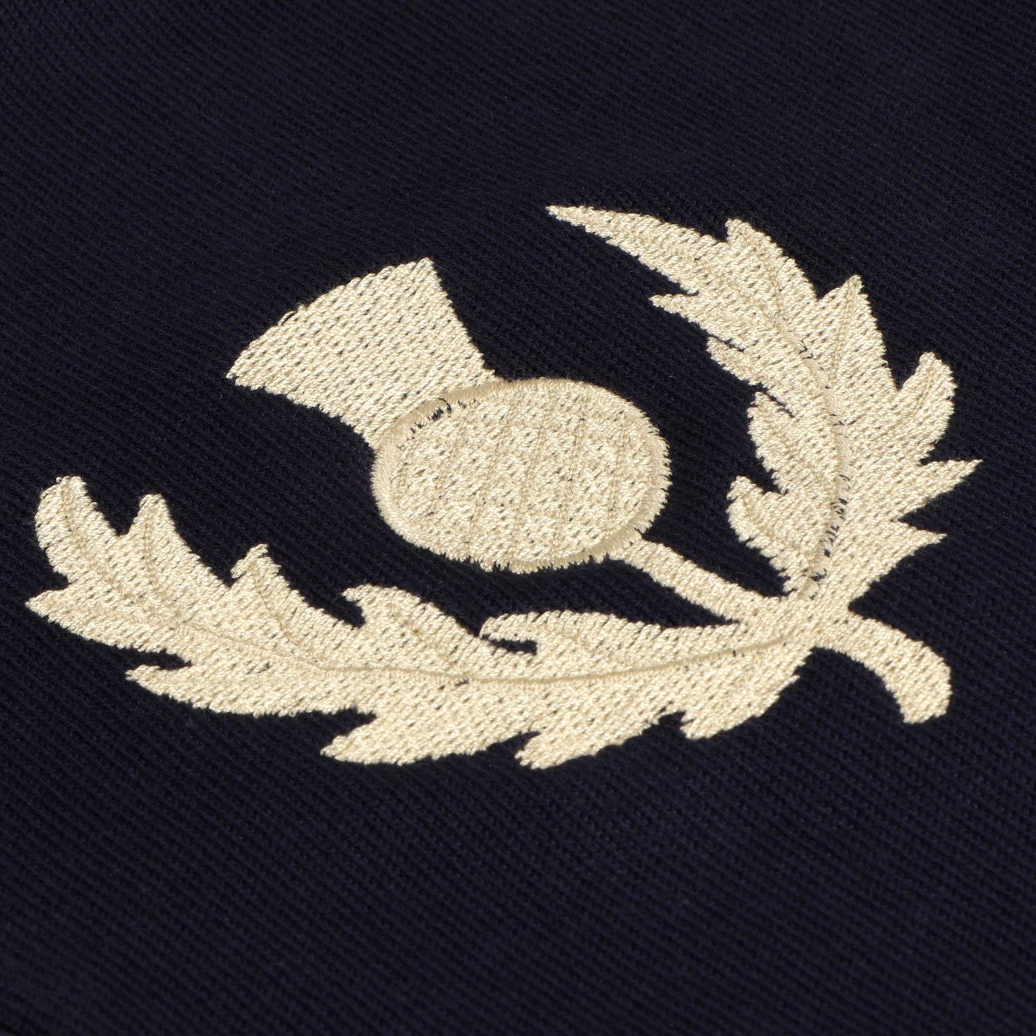 Super heavyweight (400g / 14 oz.) navy blue rugby overshirt with beautifully embroidered thistle. Handmade in Europe. 100% cotton, knitted in the traditional 12 gauge style. Stunning material and craftsmanship. Feels incredible.