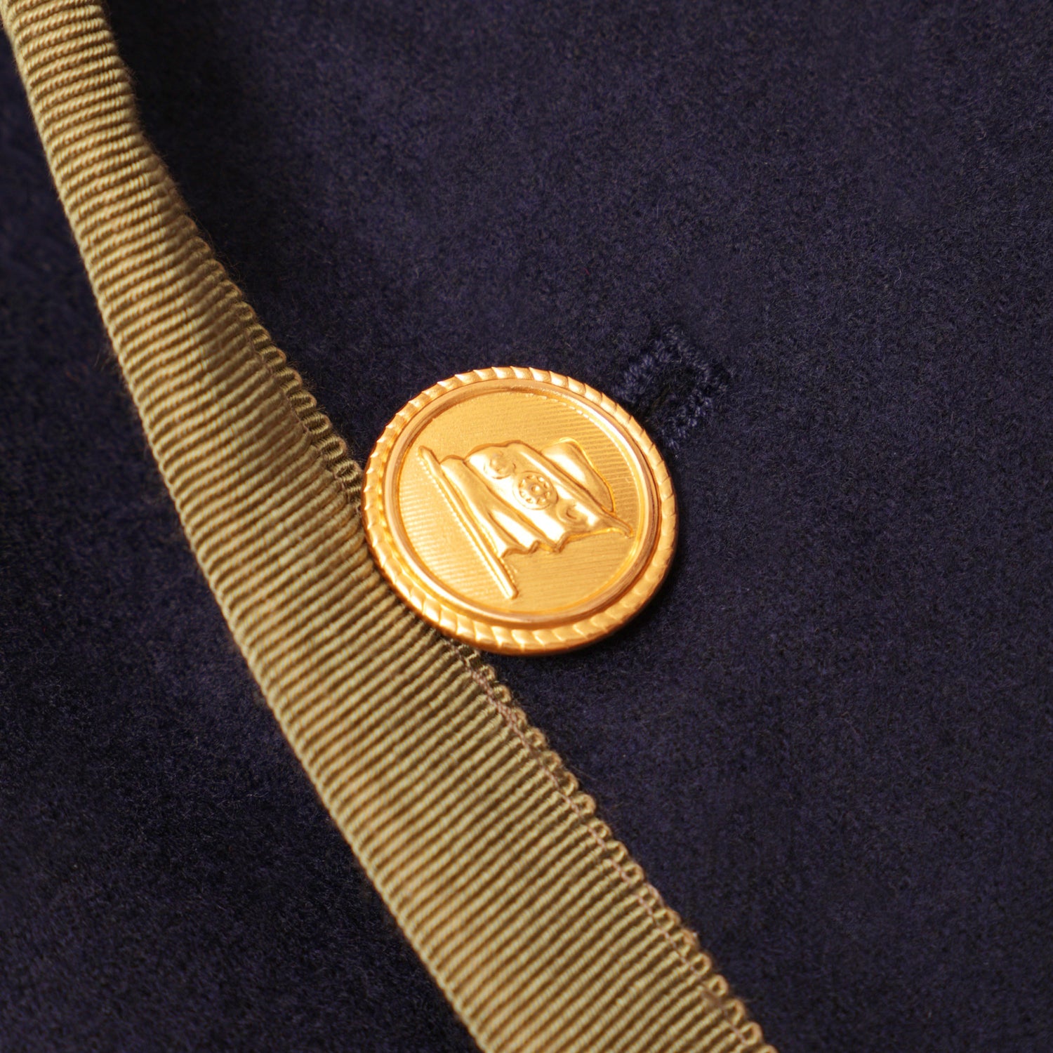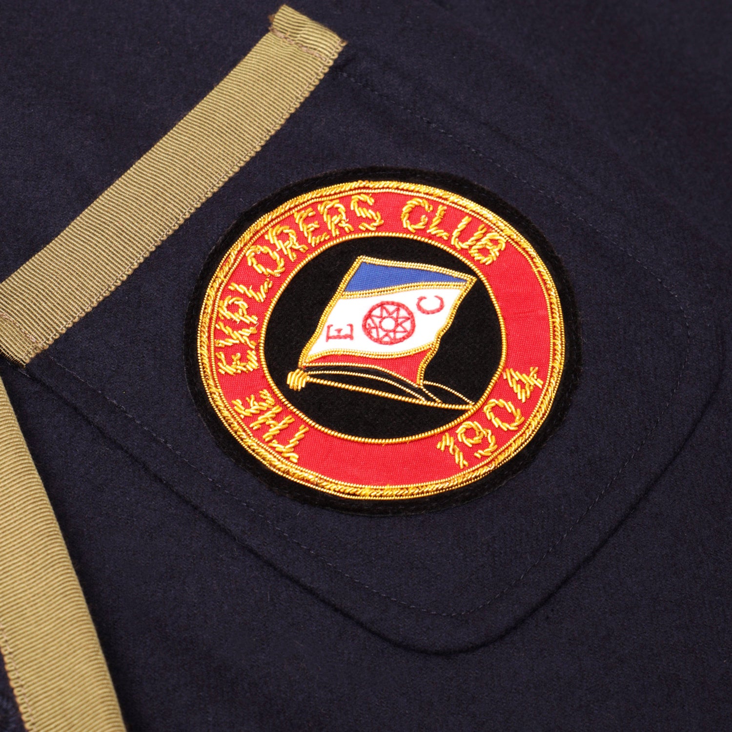 3-roll-2 silhouette in navy, American-milled wool with grosgrain trim. Ventless and unlined in the back. Brass Explorers Club buttons, hand-embroidered gold bullion wire Explorers Club pocket badge, and Explorers Club rosette included. Handmade in New York City.