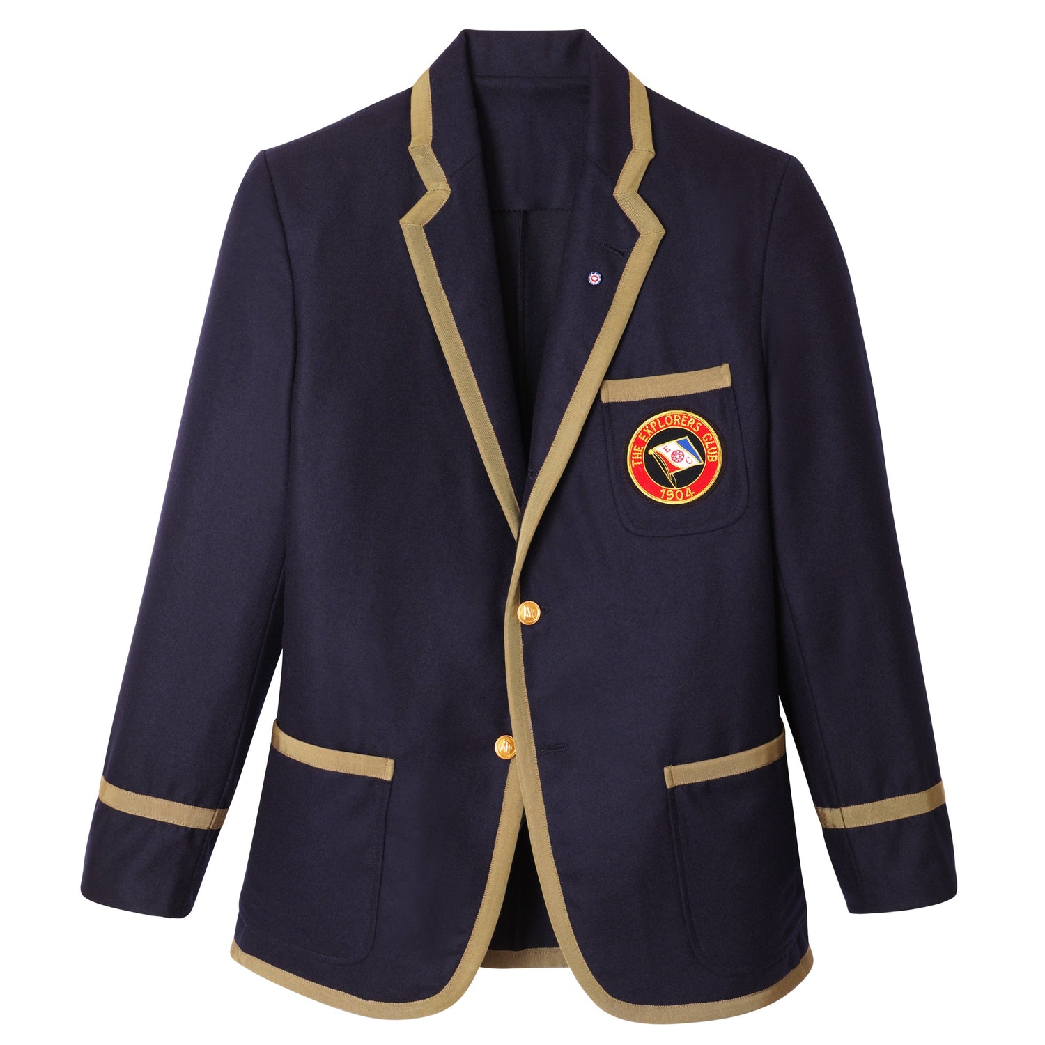 Introducing our navy wool blazer with olive trim, exclusively for members of the Explorers Club. Sharp enough to give a lecture in, comfortable enough for travel.