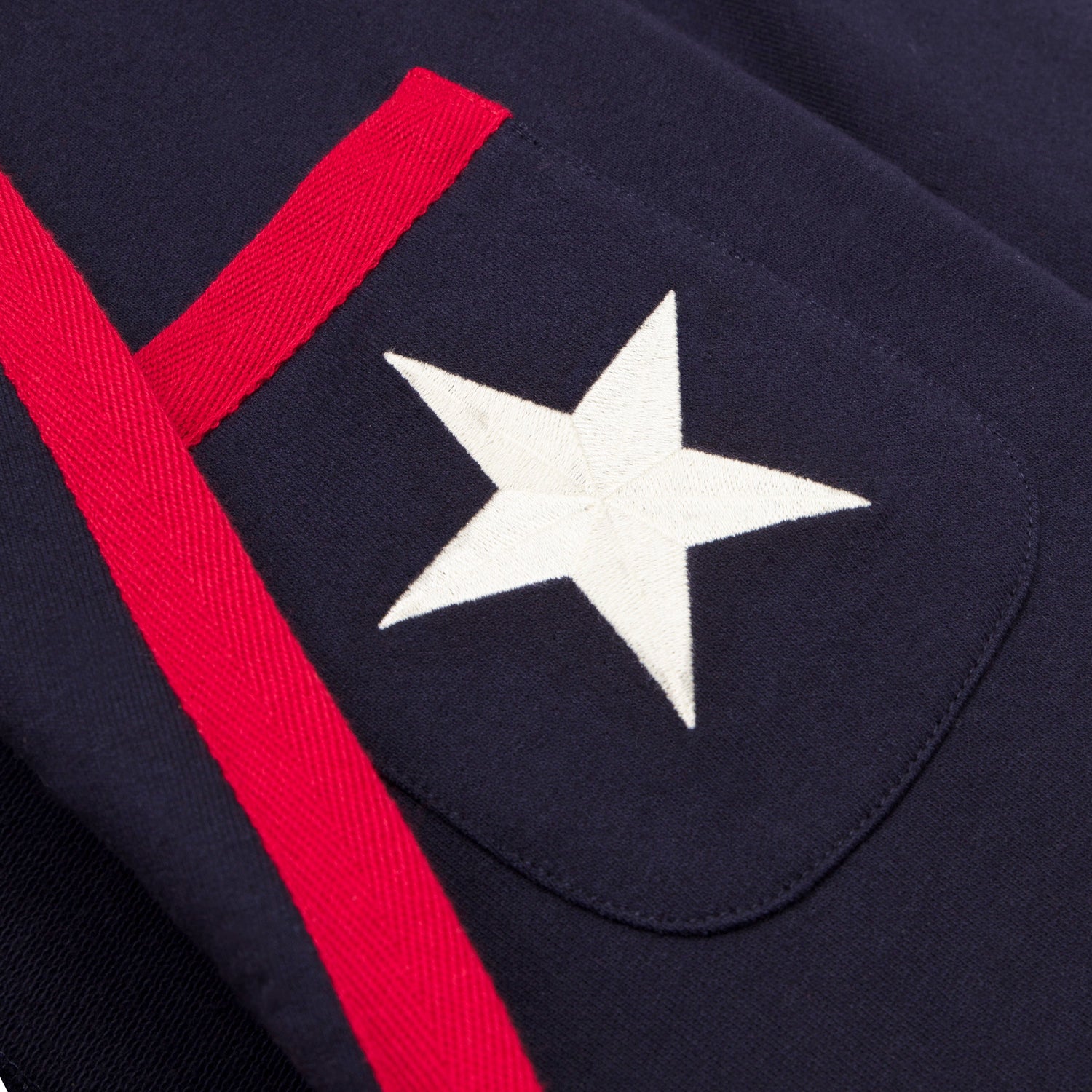 Navy blue cotton jersey blazer with red twill trim, hand-embroidered Texas star, and brass Texas star buttons. Handmade in New York. 100% American heavyweight cotton jersey. 3-roll-2 silhouette. Three patch pockets.